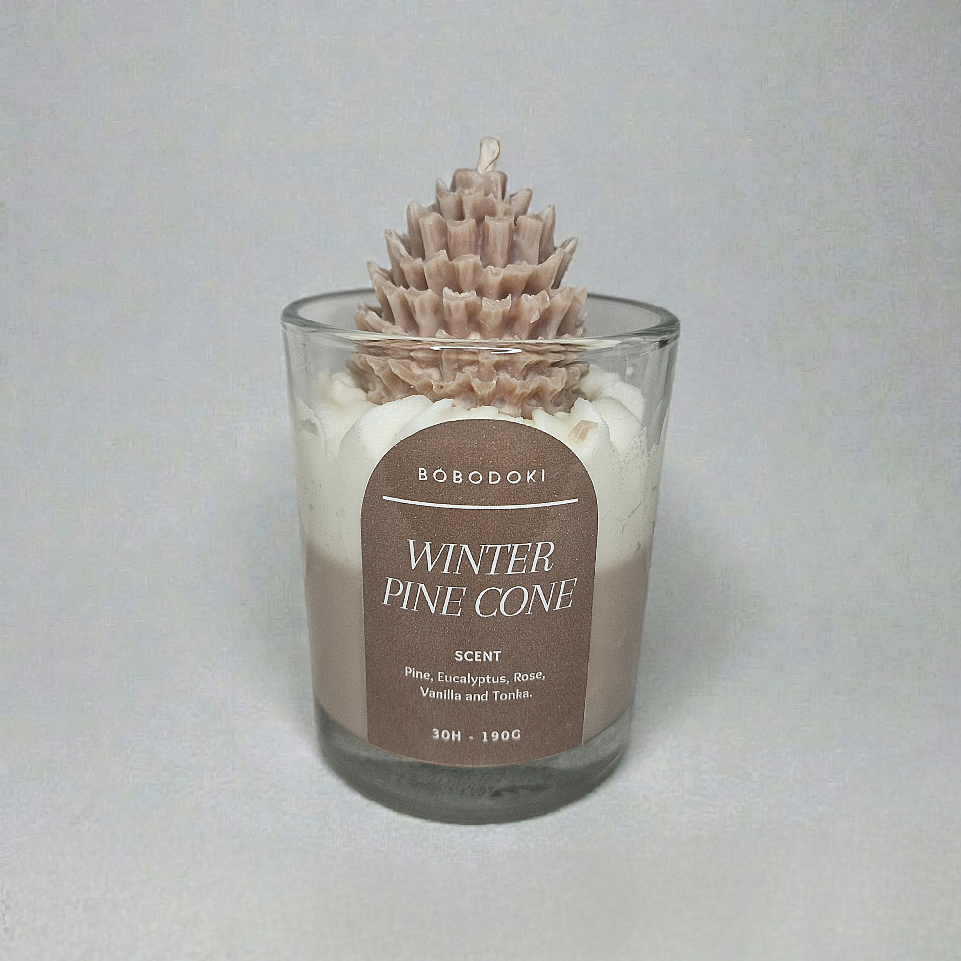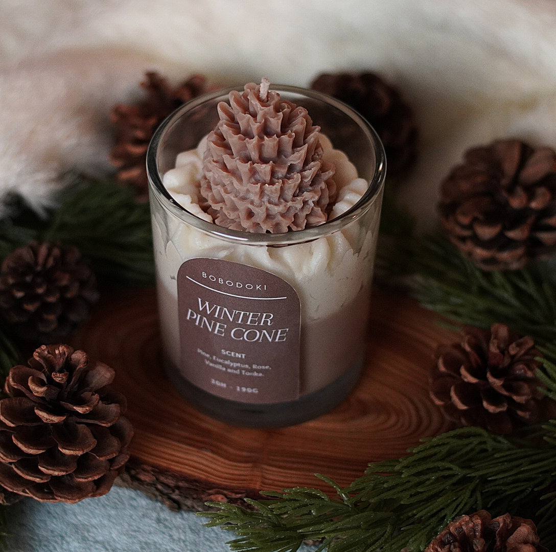 Handsmíðað úr áferðarköngli og handpípuðu vaxi sem líkist snjó, það er bæði sveitalegt og huggandi, eins og að stíga inn í kyrrlátan skóg vafinn nýsnjó.