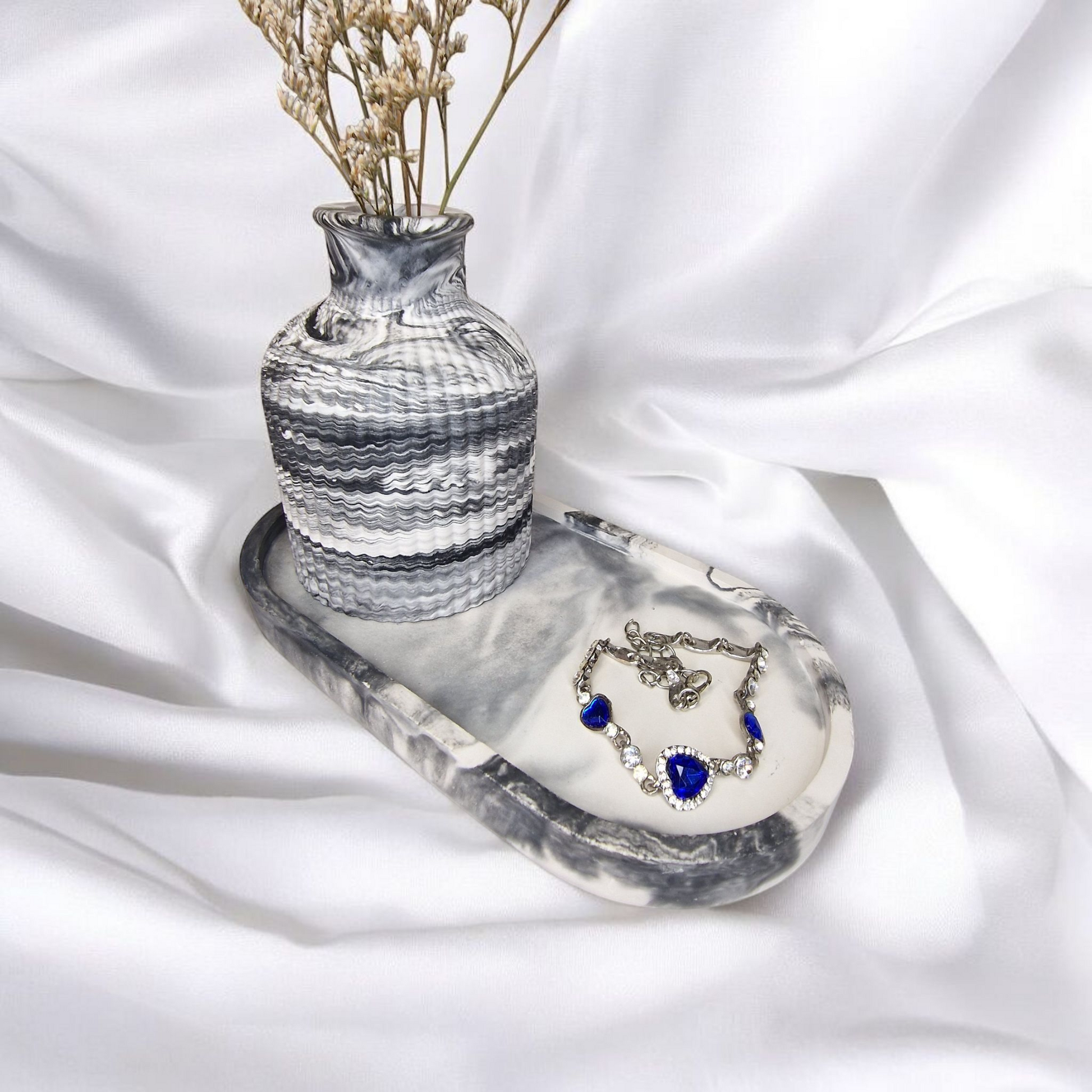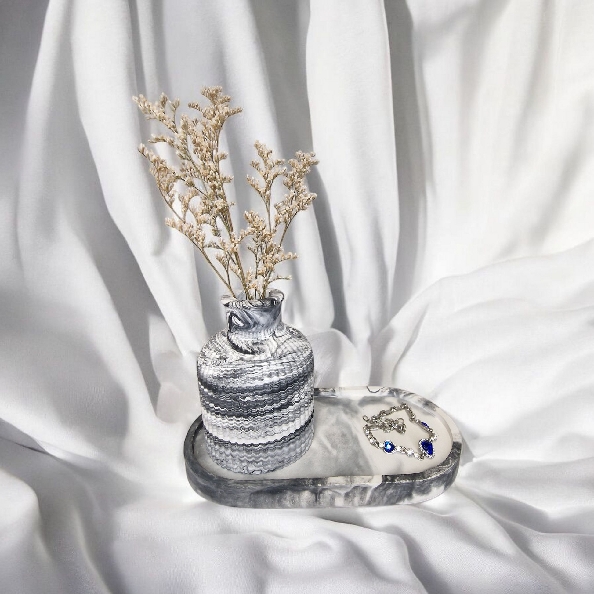 Elevate your space with this beautifully crafted handmade gypsum set, featuring a delicate tray and a matching vase. The smooth, natural gypsum finish is complemented by elegant black marble accents, adding a touch of luxury to your home.