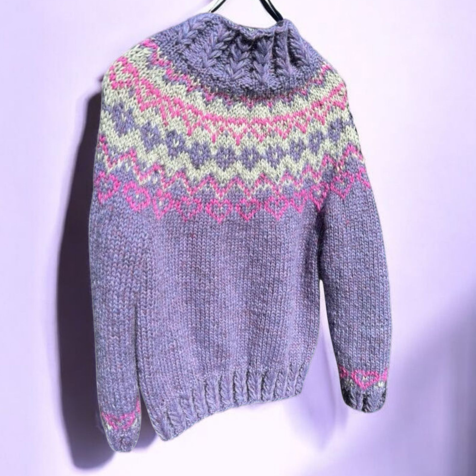 This sweater is handcrafted using Plötulopi wool. This is an Icelandic yarn known for its lightweight and airy qualities but still extremely insulating. This wool is delicate to handle due to its unspun nature, but despite its initial fragility, once knitted, Plötulopi is robust and soft, creating garments that are both sturdy, cozy and warm.