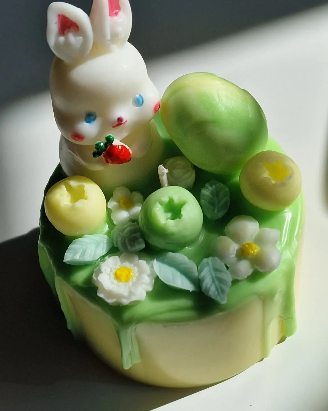 Here is another Spring and Easter inspired candle, fully made out of wax. It features a bunny, a small “Easter” egg, flowers, and berry details — all designed to look like a mini cake and as a decorative piece.