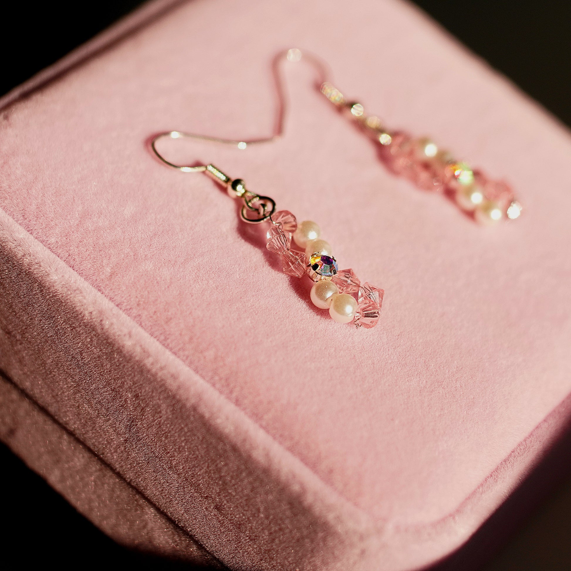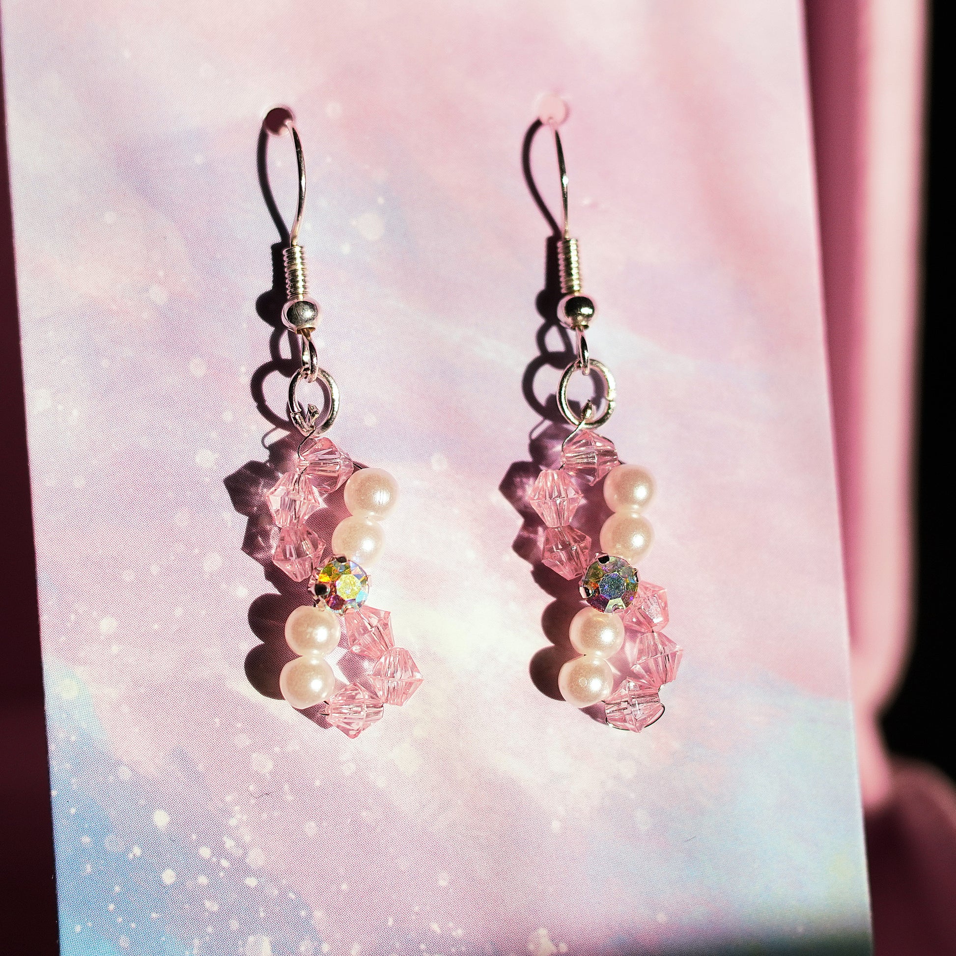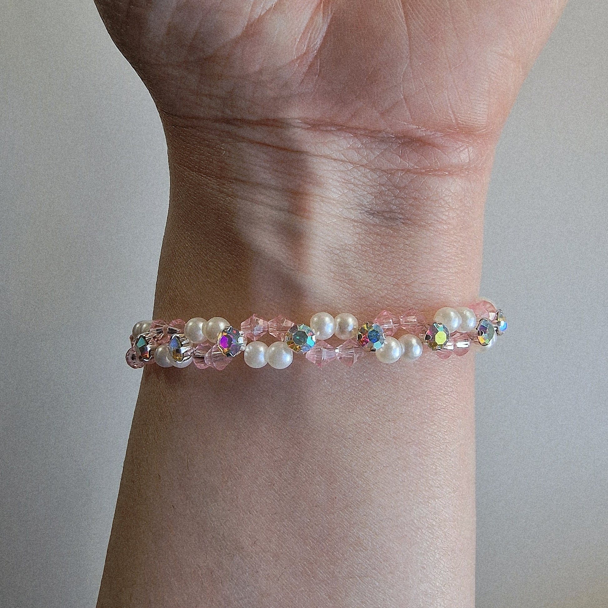 Add a touch of soft elegance to your look with this handcrafted bracelet-and-earring set. Designed with blush-pink crystal beads, luminous faux pearls, and shimmering iridescent accents, this set sparkles beautifully in any light. Lightweight, feminine, and perfect for everyday wear or special occasions.