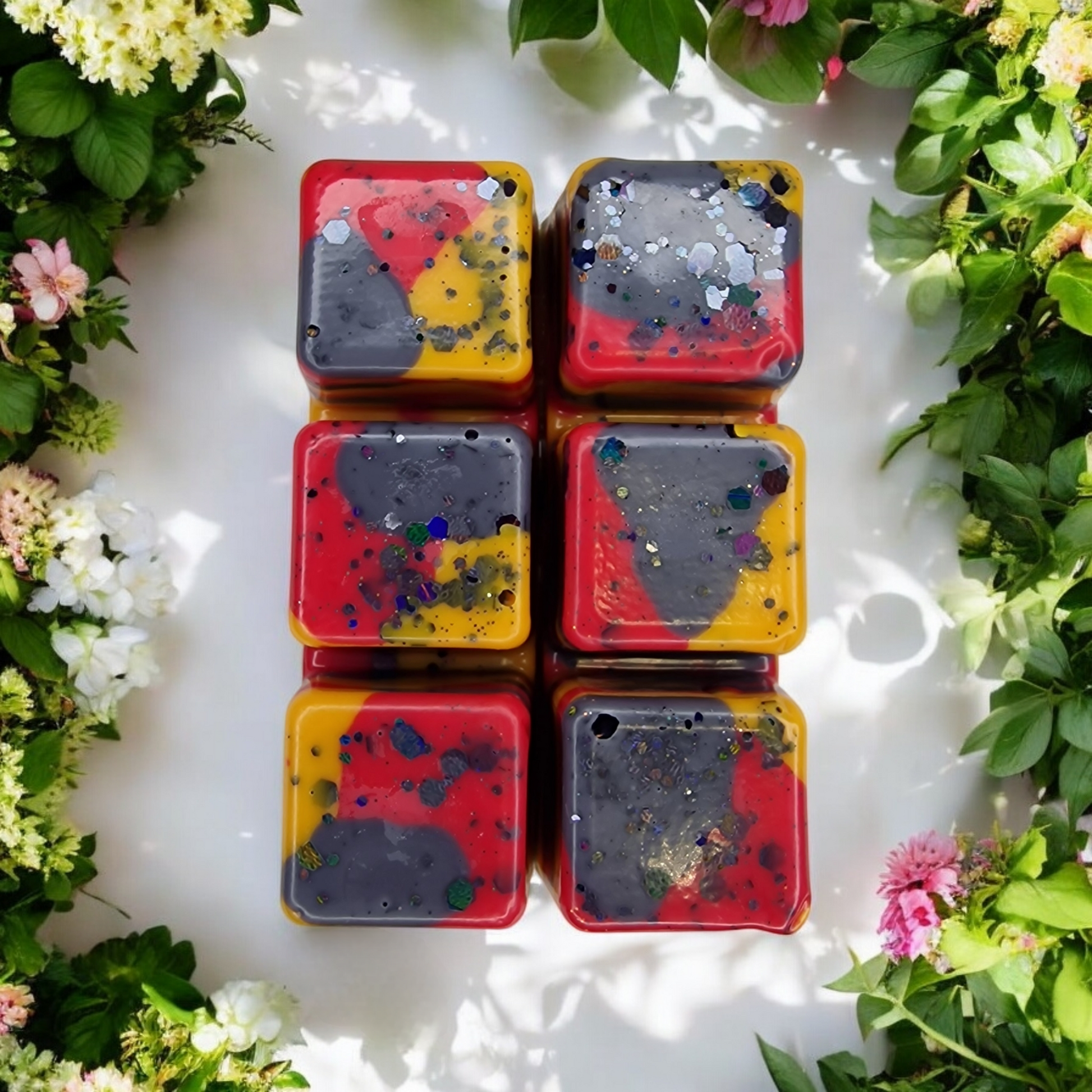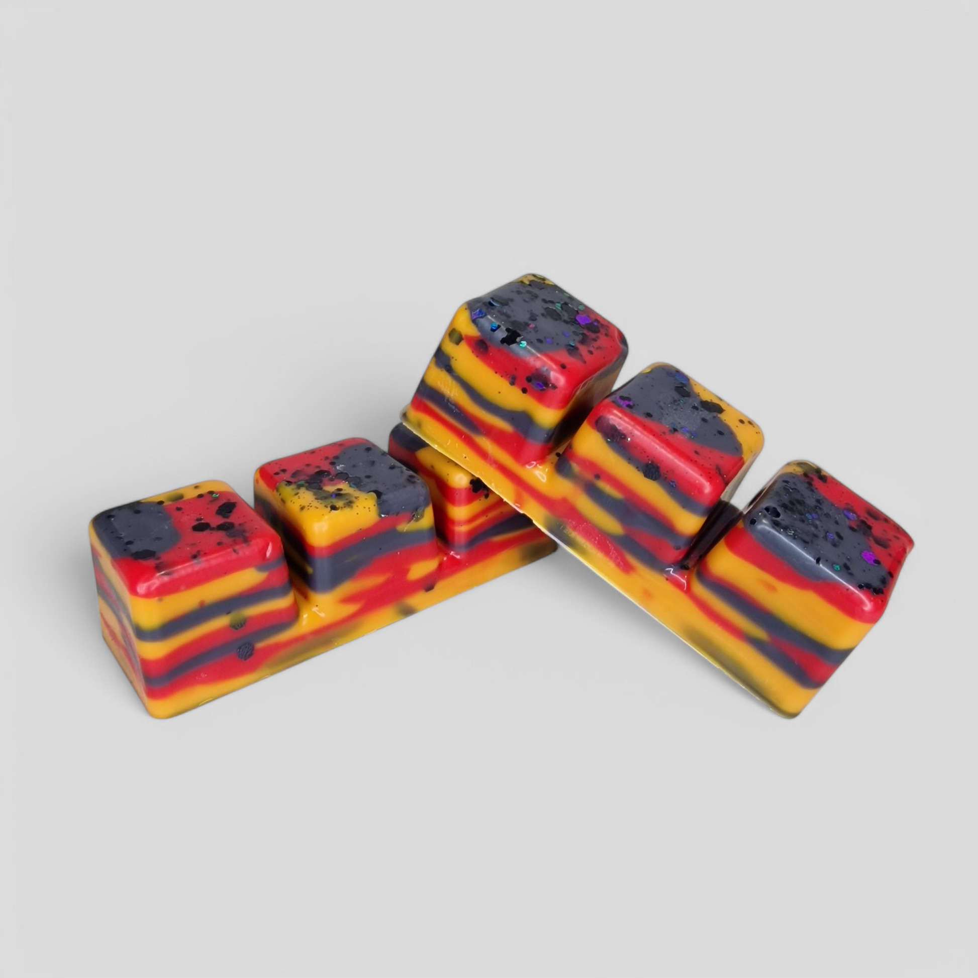 These handmade wax melts are inspired by the fiery volcanoes of Iceland, layered with striking shades of red, orange and black, mimicking molten lava and volcanic rock. Scented with woodsmoke and leather, they fill your space with the rich, comforting smell of a cozy campfire.
